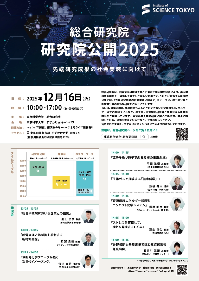 東京科学大学(Science Tokyo)総合研究院は、旧東京医科歯科大学と旧東京工業大学の統合により、両大学の研究組織を一体化して誕生した新しい組織です。このたび開催する研究院公開では、「先端研究成果の社会実装に向けて」をテーマに、理工学分野と医歯学分野の多彩な研究を紹介します。
