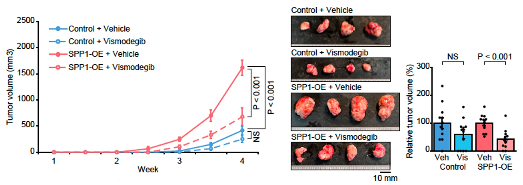 加えて、SPP1過剰発現肝がん細胞と肝星細胞の共培養実験により、SPP1がCD44を介してHedgehog/GLI1シグナルを誘導し、肝星細胞を活性化することが明らかとなりました。また、Hedgehogシグナル阻害剤vismodegibの投与により、肝星細胞の活性化、腫瘍内線維化、および腫瘍増殖が抑制されました。以上の結果から、SPP1–CD44–Hedgehog経路[用語1]は、腫瘍内線維化と肝がん進展を促進する中心的な経路であり、予後予測因子および治療標的となり得ることが示唆されました。