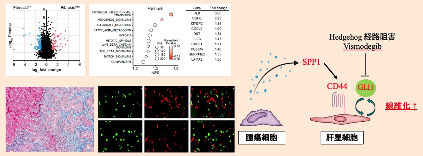 - 肝がん細胞由来SPP1がCD44を介してHedgehog/GLI1シグナルを活性化し、肝星細胞を誘導することで腫瘍内線維化と腫瘍増殖を促進する分子メカニズムを解明。