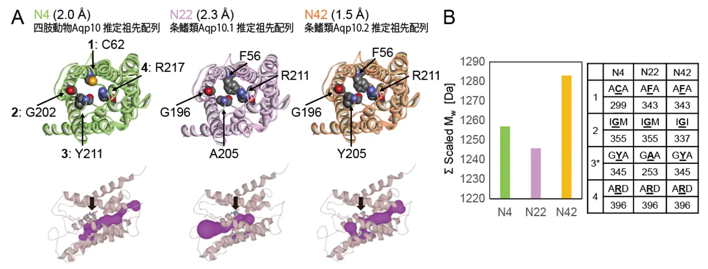 Aqp10.1とAqp10.2のアミノ酸配列が持つ特徴を明らかにするため、さまざまな条鰭類のゲノムデータベースからAqp10.1とAqp10.2の配列を集めて分子系統解析を行い、それぞれの祖先配列[用語8]を推定しました。同時に四肢動物Aqp10の祖先配列も推定しました。次に、推定した祖先配列の立体構造とその細孔構造を分子計算により予測したところ、二つの重要な発見をしました。一つ目として、Aqpに存在する水や溶質を透過する際の通り道となる細孔は、四肢動物Aqp10と条鰭類Aqp10.1では大きく、条鰭類Aqp10.2では小さいことを見出しました。二つ目として、細孔に存在することが知られる芳香族/アルギニン(ar/R)選択フィルターにおいて、それらの形成に関与する4つのアミノ酸残基の分子量の総和が四肢動物Aqp10と条鰭類Aqp10.1では小さく、条鰭類Aqp10.2では大きいことを見出しました(図2)。これらの発見から、条鰭類Aqp10.2はar/R選択フィルターに大きなアミノ酸残基を用いることで細孔を狭め、尿素・ホウ酸の透過性を減弱させたり無くしたりしている可能性が示唆されました。