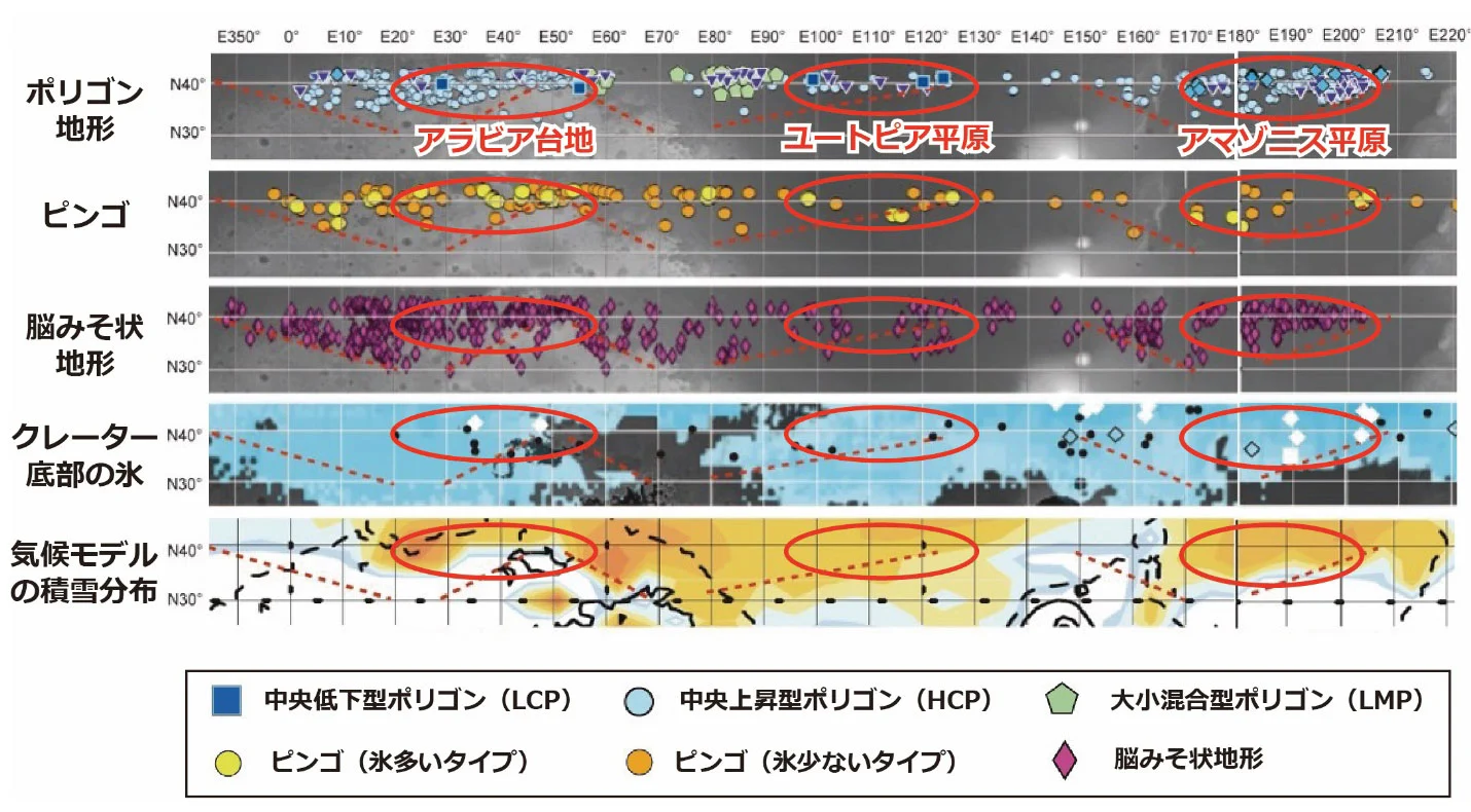 具体的には、東経0°〜60°のアラビア台地、80°〜125°のユートピア平原、160°〜210°のアマゾニス平原の領域で、特に3つの周氷河地形が密集して分布していることが明らかになりました。一方、西半球(東経230°〜350°)では周氷河地形が少ないことも明らかとなりました。この周氷河地形の分布は、クレーター底部に氷が露出した場所や、気候モデルで推定されている積雪量の多い場所の分布ともよく似ていました。