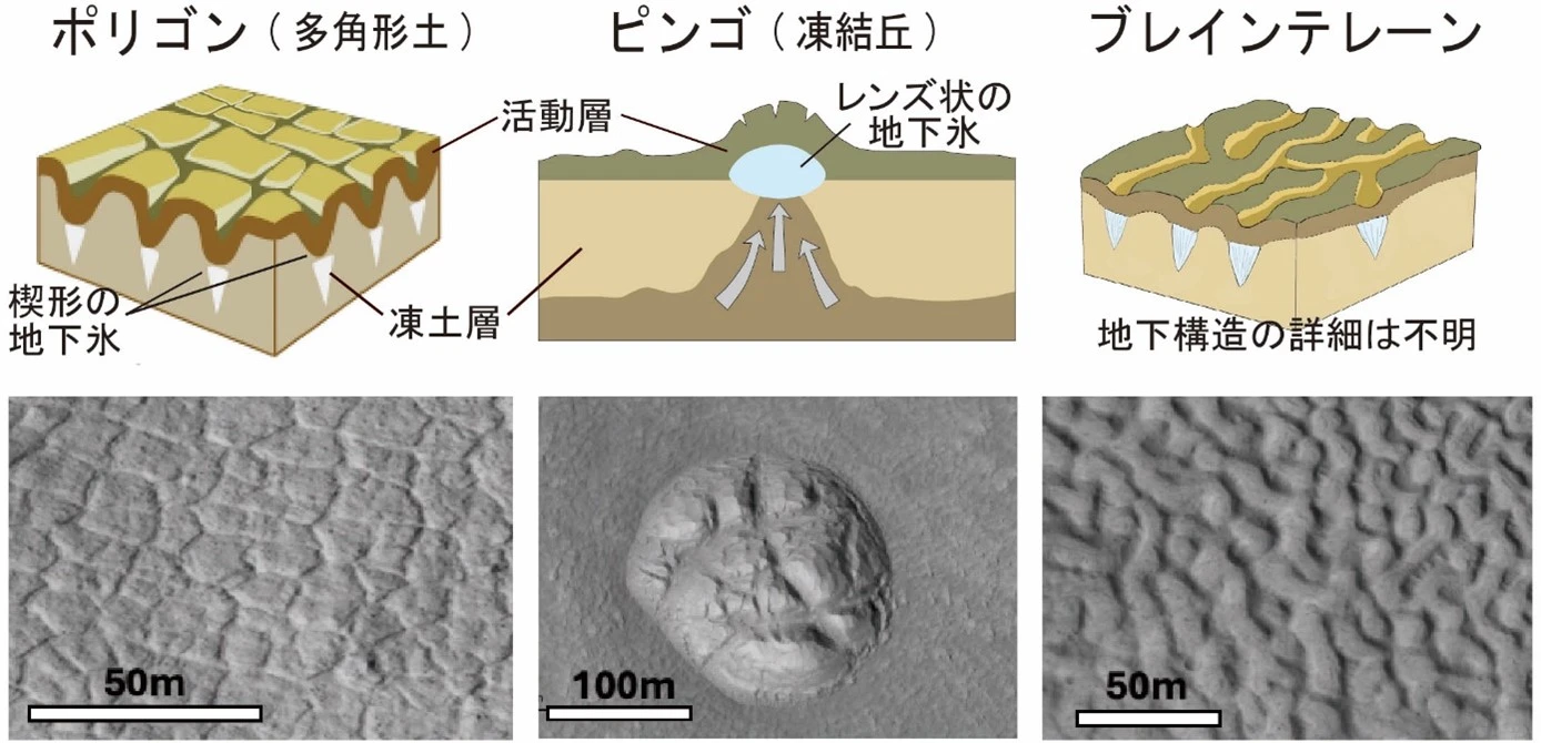 - 周氷河地形:氷が地下にあることによって形成される特殊な地形で、永久凍土帯に多く見られる。火星の中緯度でも地球に似た地形が発見されており、地下氷の存在を示唆する指標として利用されている。