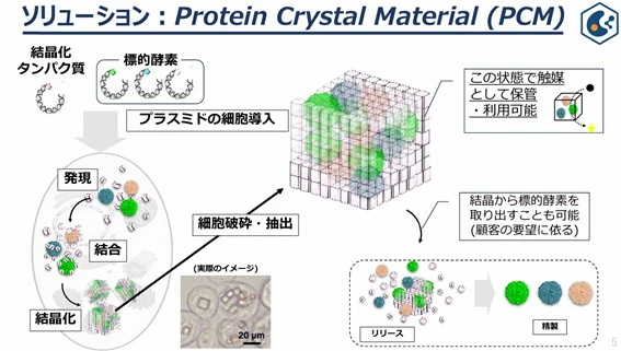 Xtelligenceは、細胞内で生産された酵素を「PCM - Protein Crystal Material」と呼ばれる結晶タンパク質で内包することで、あらゆる高付加価値酵素の生産・利用を可能にします。