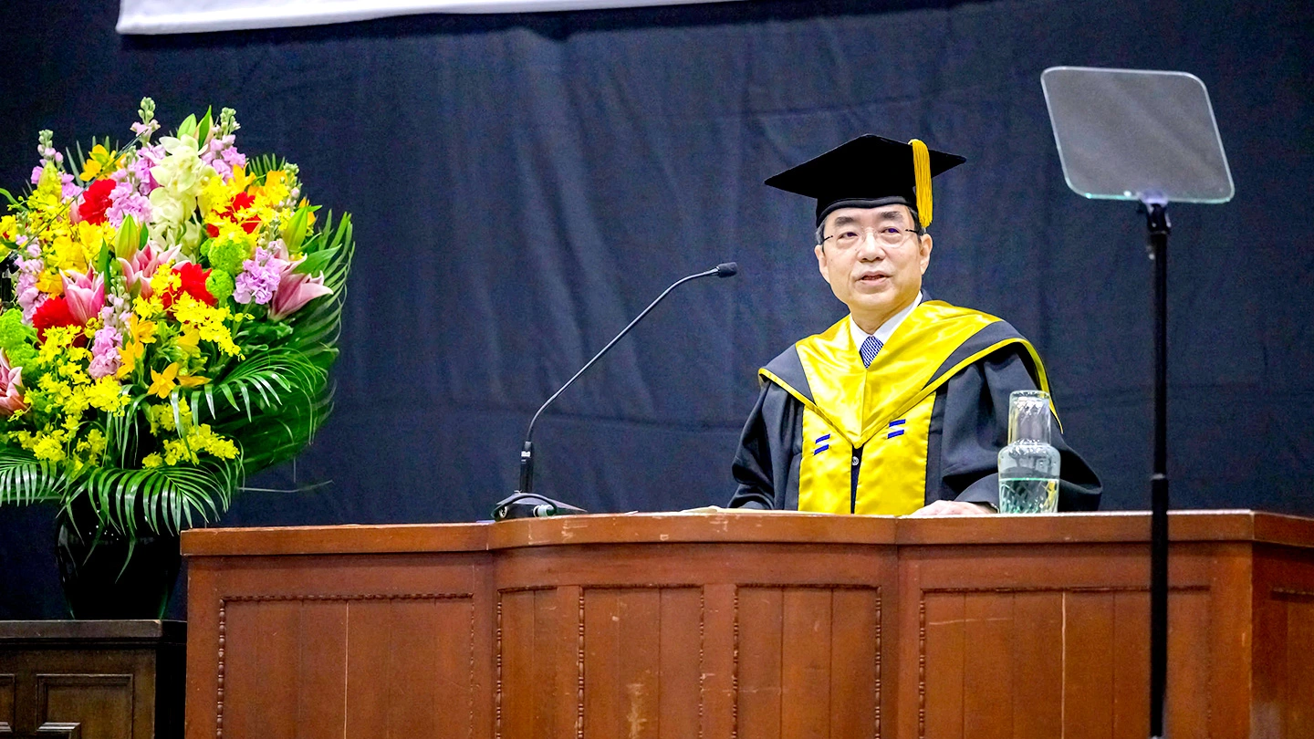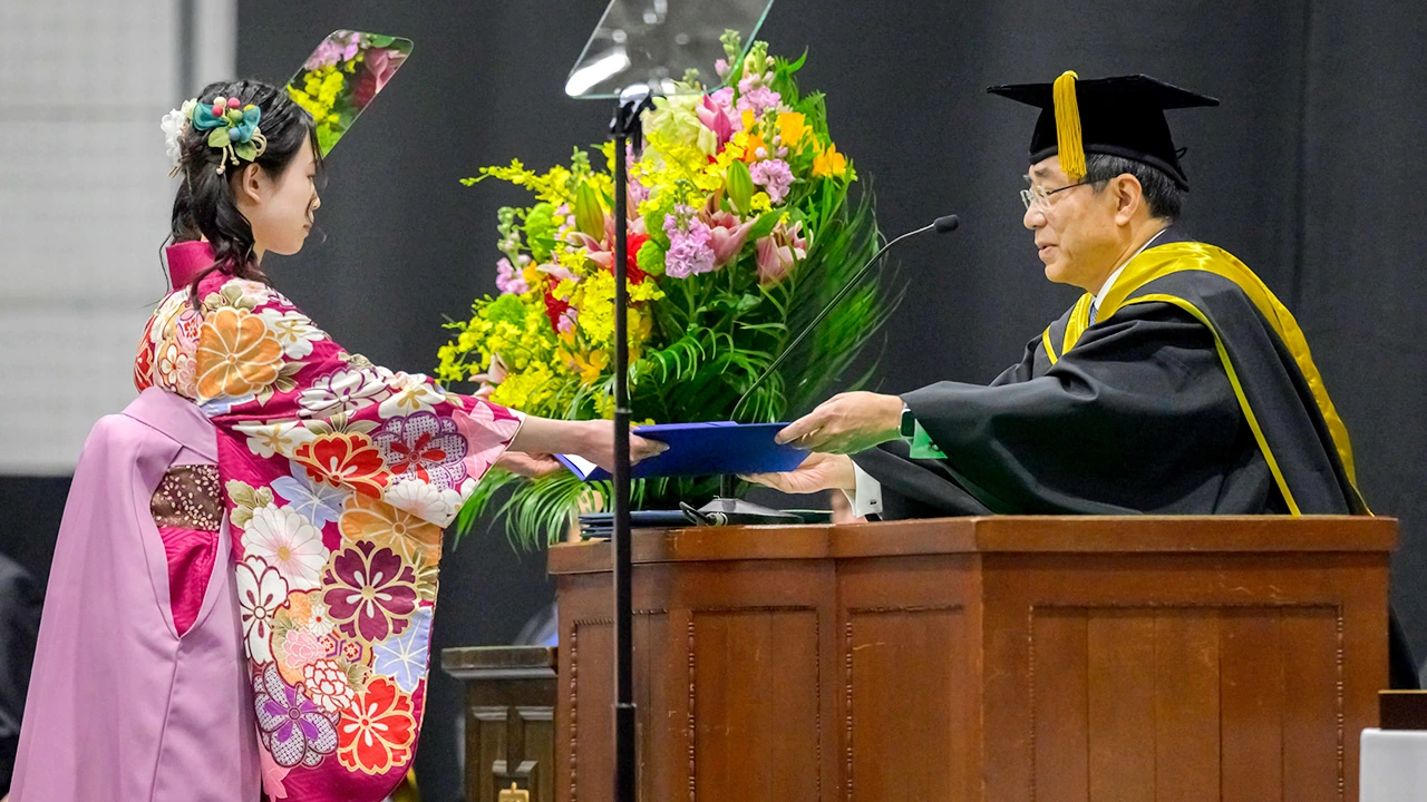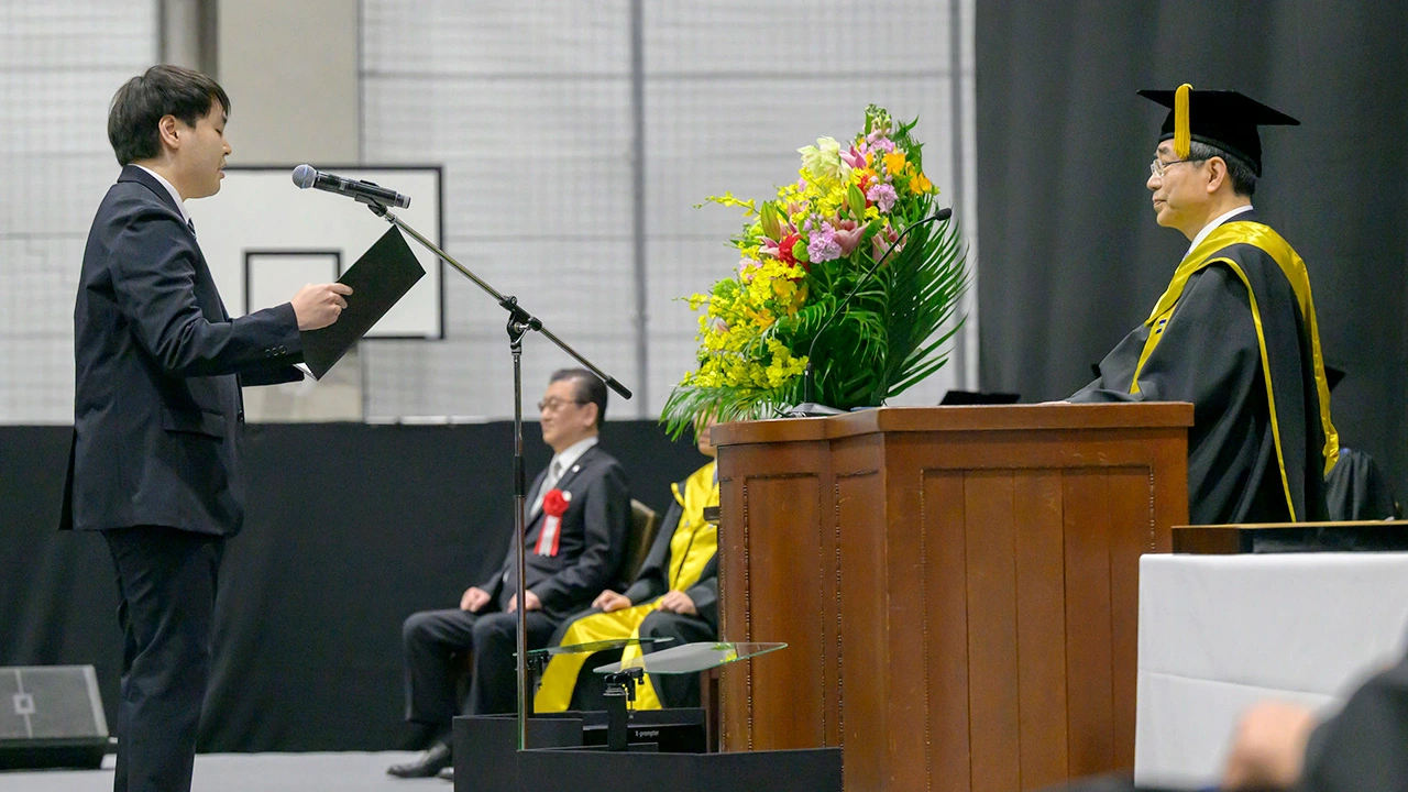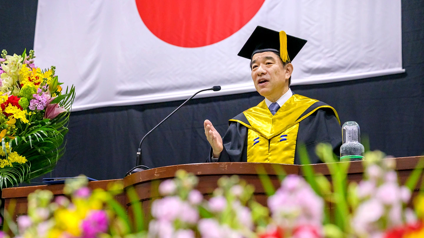 田中雄二郎学長は式辞として「変化の時代を切り拓く知性の重要性を示し、異なる価値観との出会いを通じて自らを高めてほしい」 と述べました。また、その学びを、科学の進歩と人々の幸せとを結ぶ力として社会に活かすことへの期待が語られました。