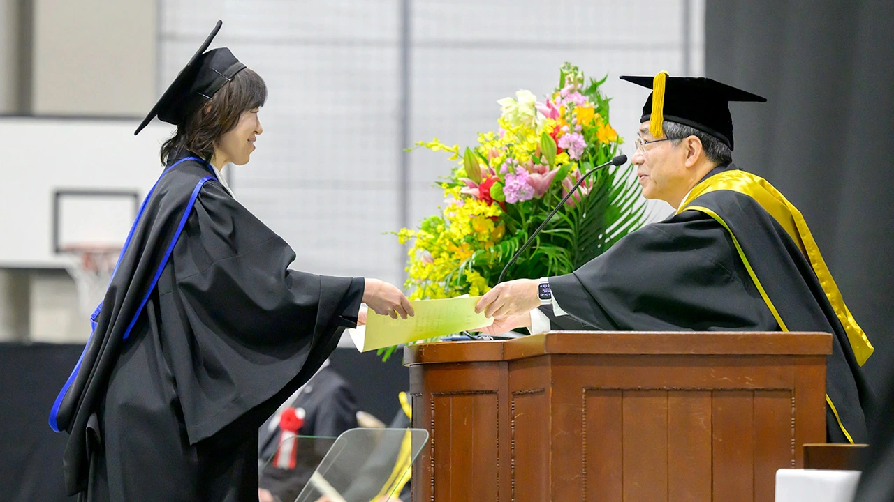 また、大竹尚登理事長は祝辞として、卒業生・修了生へ心からの祝福を贈るとともに、自らの知識や能力、スキルをより良い未来のために役立てようと呼びかけました。また「人々の生活を豊かにし、共に生きる社会を強固なものにし、この美しい地球を守るために、あなたには何ができるだろうか」と問いかけました。
