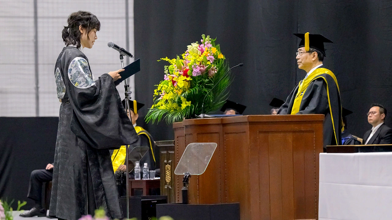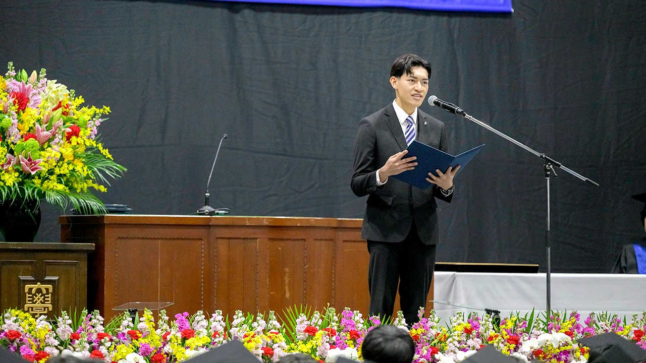また、学士課程在学生を代表して理学院化学系の香田陸さん、大学院課程在学生を代表して情報理工学院情報工学系のKENGKANNA APAKORNさんが、門出を祝う温かな送辞を贈り、式典を締めくくりました。