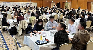 本研究成果報告会は、さまざまな企画を通じて多様な価値観を持つ大学院の仲間たちと出会い、研究成果や技術や知識を共有し、将来の夢を語り合うことを目的に企画されています。すべての学生が「他分野の研究者にも伝わる」ポスターを作成して参加し、仲間がどのような研究をしているかお互いに学び、積極的にディスカッションしていました。4つの講演に加え、今回は参加者間の交流を促進することを目的として、専門分野・学年・出身が多様な6人によるグループワークを5回行いました(写真1)。