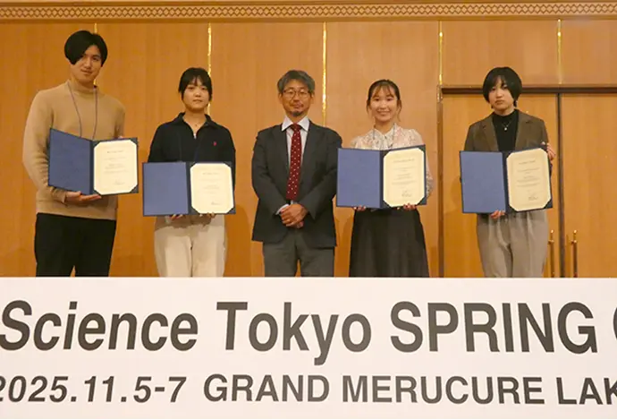 Science Tokyo SPRING (MD) 生を対象に、2024年8月以降に応募者本人が学術誌で発表または発表が決定した研究成果を募り「Science Tokyo SPRING (MD) 賞」として表彰しました。最優秀賞には公衆衛生学分野の片桐碧海さん、優秀賞には臨床分析・分子生物学分野の佐々木敏莉さんと歯科公衆衛生学分野の島田怜実さん、論文発表賞には山野春樹さんとWANG KEWEIさんが選ばれました。(写真3)