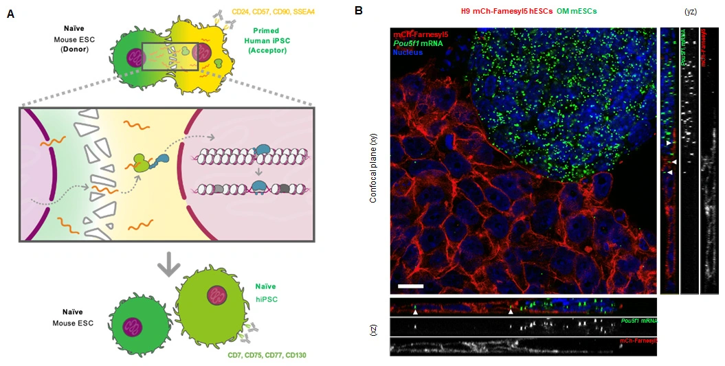 - 細胞同士が直接接触した際に生じるマウスES細胞からヒトiPS/ES細胞へのmRNAの移動が、ヒト細胞をより未分化なナイーブ型へリプログラムすることを発見。