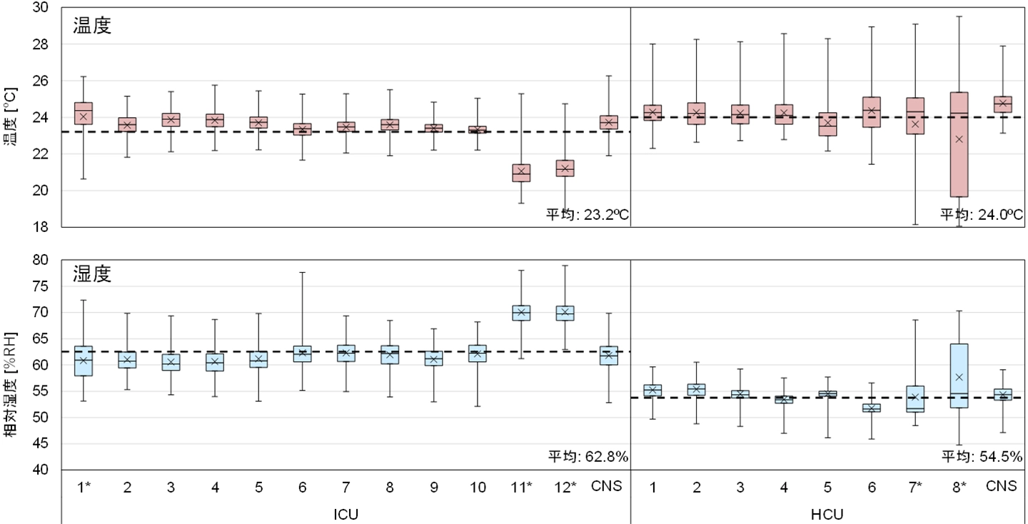 環境測定の結果、温度のICU平均は23.2℃、HCU平均は24.0℃、湿度のICU平均は62.8%、HCU平均は54.5%でした(図1)。日本集中治療医学会の集中治療部設置のための指針[参考文献1]では、「年間を通して温度は24~25℃、相対湿度は50%が望ましいが、患者の快適性にも選択基準を置き、良好な室内環境を保持すること」とされており、平均的には良好な環境に保たれていました。温度が低く湿度が高い一部の個室(図1中のICU 11、12)は、オープンフロアと個室のICUが同じ空調機で制御されていることから、個別に調節ができず、個室のICUが過冷却になった可能性があります。