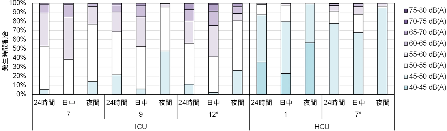 等価騒音レベルについては、ICUの3つの病床の24時間平均は57.7 dB(A)、夜間は54.5 dB(A)でした。1分間の等価騒音レベルを5dB(A)ごとに区分して発生時間の割合を見ると、ICUの3つの病床で、日本集中治療医学会の「集中治療部設置のための指針」が推奨する45 dB(A)を下回る時間がありませんでした(図4)。一方で、HCUの2つの病床の24時間平均は50.2 dB(A)、夜間平均は47.3 dB(A)で、HCUでは45 dB(A)を下回る時間もありました。ICUとHCUでは、ICUの方が患者さんの重症度が高いため、騒音源となる医療機器の数が多かったことが、この違いの一因と考えられます。