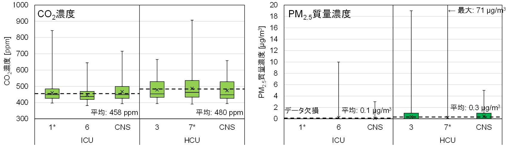 空気質については、CO2濃度のICU平均は458 ppm、HCU平均は480 ppm、PM2.5質量濃度のICU平均は0.1 µg/m3、HCU平均は0.3 µg/m3でした(図2)。これは新型コロナウイルス感染症流行時の基準であるCO2濃度1,000 ppm以下やWHO global air quality guidelines[参考文献2]の15 µg/m3の基準を大幅に下回る結果で、空気質は全体として非常に良好でした。