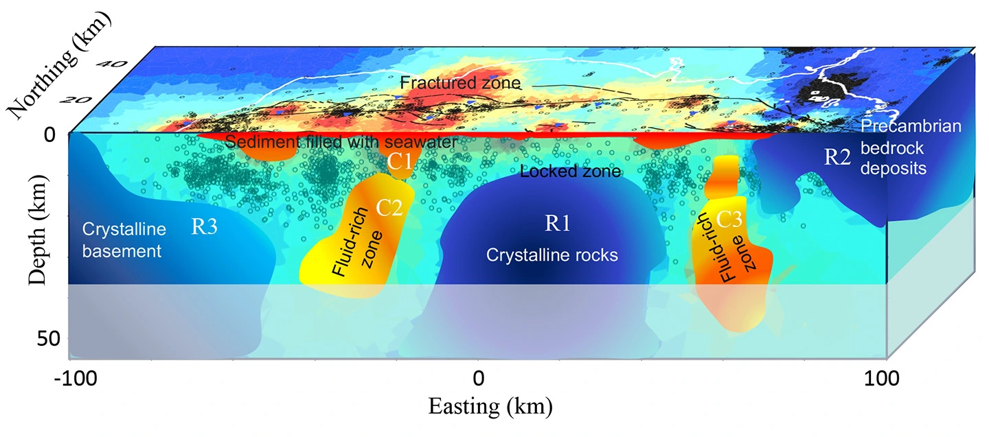 図. トルコ国マルマラ海海底下の北アナトリア断層の3次元比抵抗構造図。暖色系が流体に富む変形域、寒色系が流体に乏しい固着域を表す。(Kaya et al., 2025)