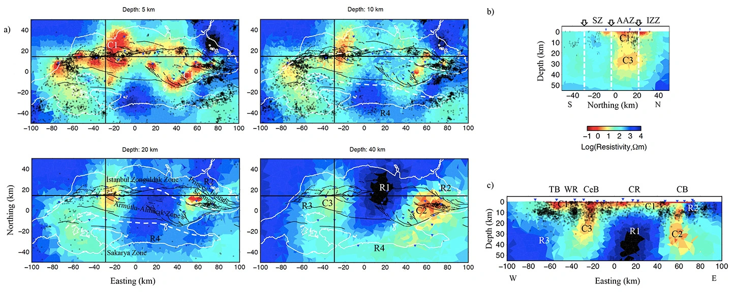図2. a)深度ごとの比抵抗分布とb)南北断面図と c)東西断面図(Kaya et al., 2025)