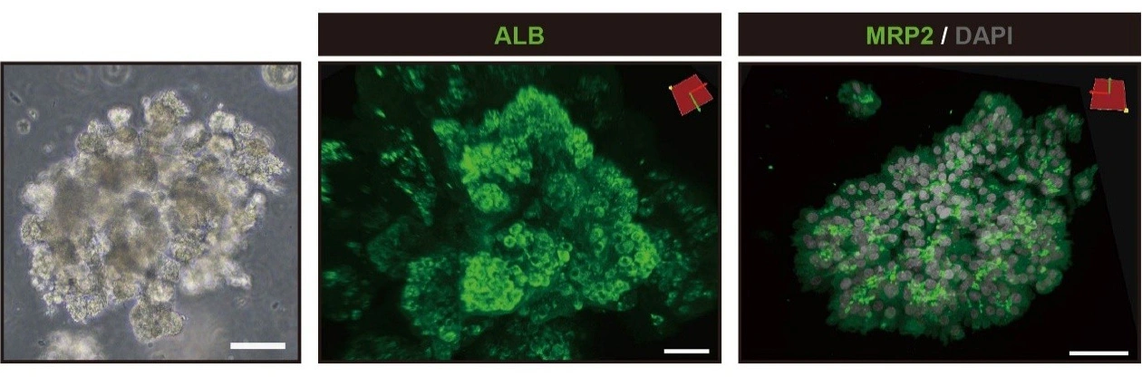 iHOは3ヵ月間以上、条件によっては6ヵ月間以上の長期培養が可能であり、その間もブドウ房様の特徴的な形態や、肝細胞の性質を示す遺伝子発現を継続して維持していました。