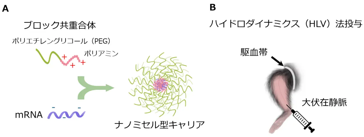 - ナノミセル型mRNAキャリア(ナノミセル型キャリア):本研究グループによって開発されたmRNA送達用ナノ粒子。ナノミセルとは、親水性ポリマー(ポリエチレングリコールなど)と、疎水性や電荷をコントロールした機能性ポリマー(ポリアミノ酸誘導体など)の2つの部分から成るブロック共重合体が凝集して形成されるナノ粒子で、周囲を親水性ポリマーの外郭で覆われた粒子の内部に、薬物や核酸分子を封じ込めることができる。mRNA送達用に最適化されたナノミセルを用いて、これまで脳、脊髄、関節軟骨など種々の臓器、組織に対してmRNAを安全に送達し、機能させることに成功している(図2参照)。