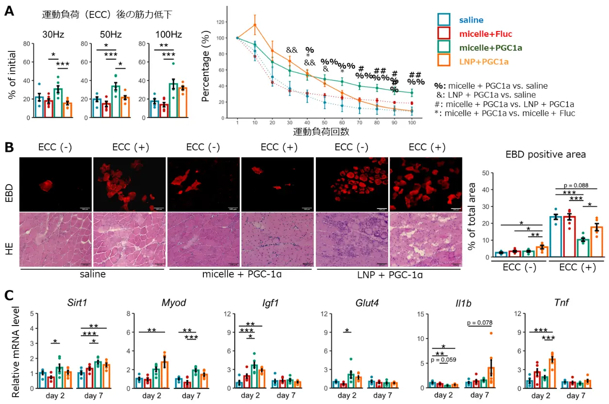 また、投与後の筋組織の遺伝子発現解析では、ミトコンドリア活性の指標であるSirt1などの遺伝子群、筋活動に関連する遺伝子群(MyoD、Glut4など)、および筋肥大に関与する遺伝子(IGF-1など)の発現が増加していました(図3c)。これにより、PGC-1α mRNAの投与が細胞内シグナルを活性化し、筋症状改善の治療効果をもたらしたと考えられました。
