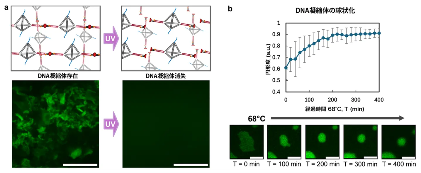 さらに、本材料の応用可能性を探るため、外部刺激による制御を試みました。光分解性スペーサー[用語5]をリンカーに導入することでUV照射による凝縮体の解体と、細胞透過性DNAナノ構造体の放出を実証し、制御可能な薬物送達キャリアとしての特性を示しました。また、温度刺激にも応答することを確認しました。