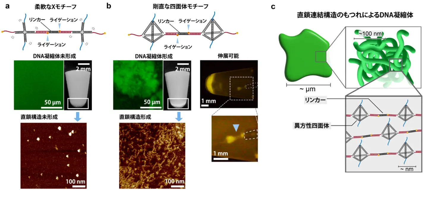 私たちは、直交[用語2]する粘着末端[用語3]を利用して一方向にモチーフを連結することで、異方的DNAナノ構造を構築しました。DNA凝縮体の構築にしばしば使われる柔軟性を持つX字型モチーフ(Xモチーフ[用語4])と、異方性を持つ硬い四面体モチーフの2種をつくり、それらを比較したところ、四面体モチーフでDNA凝縮体の形成が確認されました。これは高剛性の四面体モチーフからなる紐状の構造のもつれによって形成されたと考えられます。