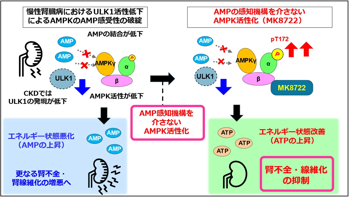 - 慢性腎臓病ではULK1発現低下によるAMP感知機構破綻を認め、AMP感知機構を介さないAMPK活性化が腎機能の悪化と線維化を改善しました。