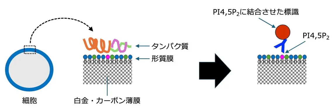 生きた細胞を急速に凍結したあと、生体膜を白金とカーボンの薄膜で物理的に固定して膜脂質を動けなくする。タンパク質などを取り除いたあとPI4,5P2に標識を結合させ、電子顕微鏡で観察する。