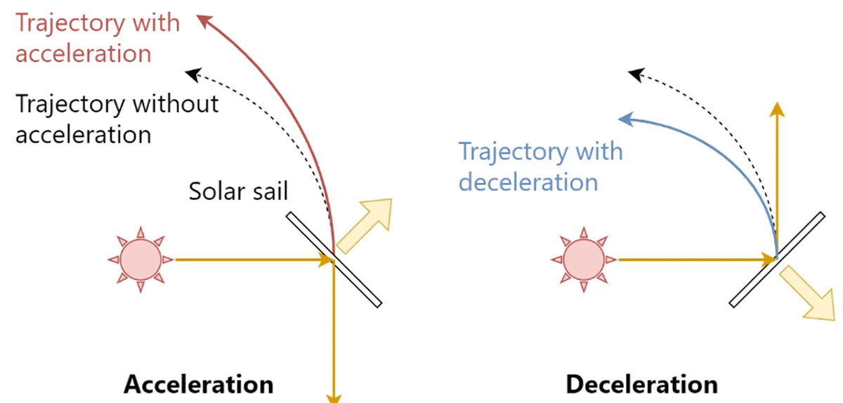 物体に太陽光が当たることで生じる力(太陽光に押される力)を太陽輻射圧と呼びます。その大きさは非常に小さく、地上ではそれを実感することはありません。しかし、宇宙空間で反射率が高い大きな帆(セイル)を広げれば、この太陽輻射圧によって長い時間をかけて加速し、軌道変更することができます。この原理を積極的に利用して推進する宇宙機をソーラーセイルと呼びます。一般的な宇宙機は、軌道変更(制御)する際には推進剤を消費してガスを噴射する必要があるため、どれだけの時間、どれだけの加速量だけ軌道変更できるかは推進機の性能と推進剤の搭載量によって決まります。一方、ソーラーセイルは推進剤を消費しないため、うまく利用すれば、原理的にはいつまでも軌道制御し続けられることになり、さまざまな宇宙ミッションに有効であるといえます。ソーラーセイルは、加速によって太陽から離れる方向にしか軌道変更できないと思われがちですが、実際は太陽方向に対する姿勢を変える(姿勢制御する)ことで、加速と減速を切り替えられるので、太陽方向から離れることも近付くこともできます(図1)。