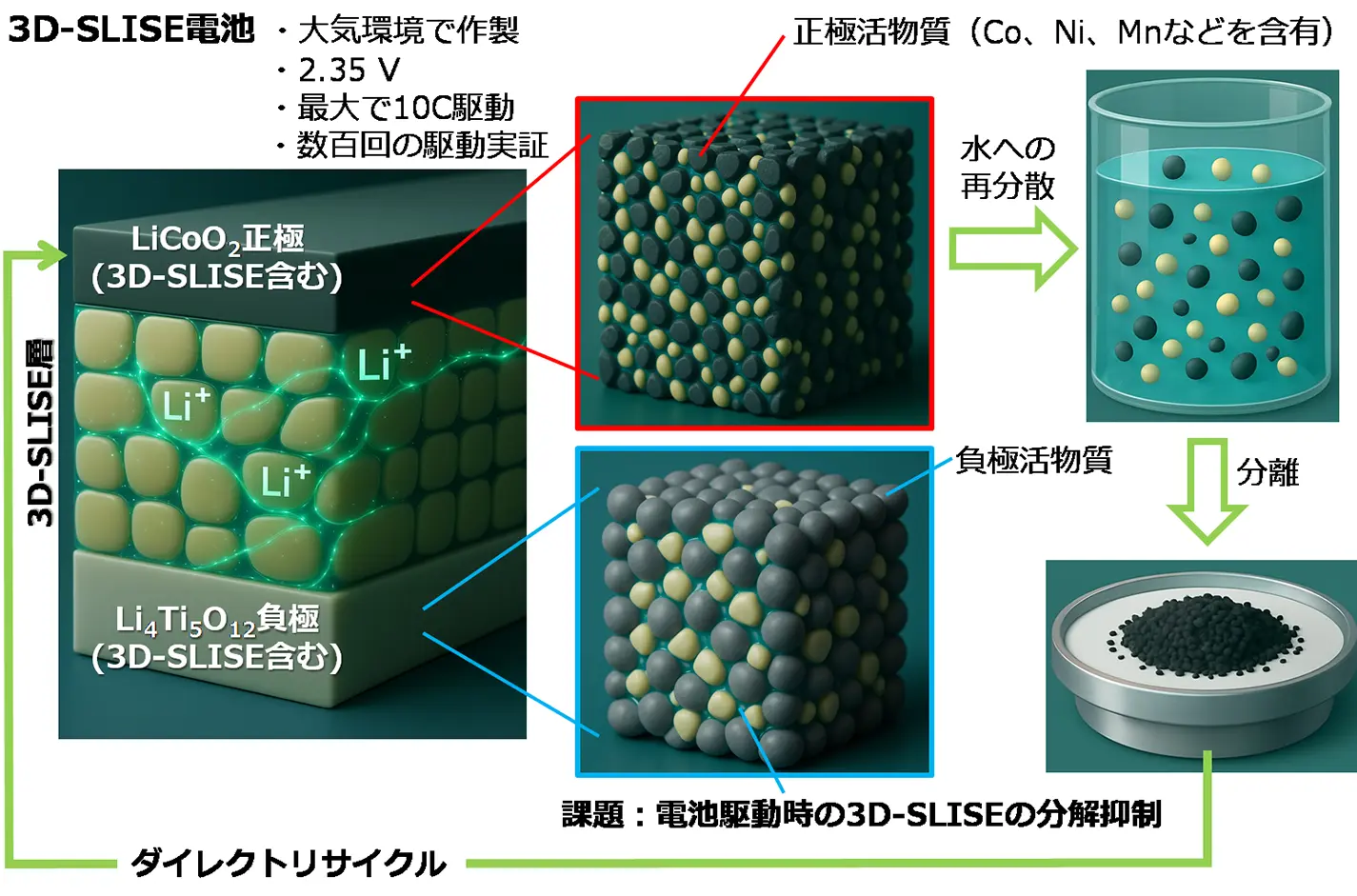 3D-SLISEは容易に水へ再分散するため、使用済み電池から活物質を直接回収できます。これは従来の金属を抽出するリサイクルとは異なり、直接材料を回収し利用できる “ダイレクトリサイクル[用語3]”の実現を意味しており、電池材料の循環利用社会を支えるコア技術となる可能性を秘めています。本研究で作製された電池はセパレーター[用語4]も可燃性電解液の注入工程も必要としない世界初の水系準固体リチウムイオン電池です。製造時にドライルームやグローブボックスなどの厳しい環境制御が不要であり、製造コストの大幅な低減も期待されます。