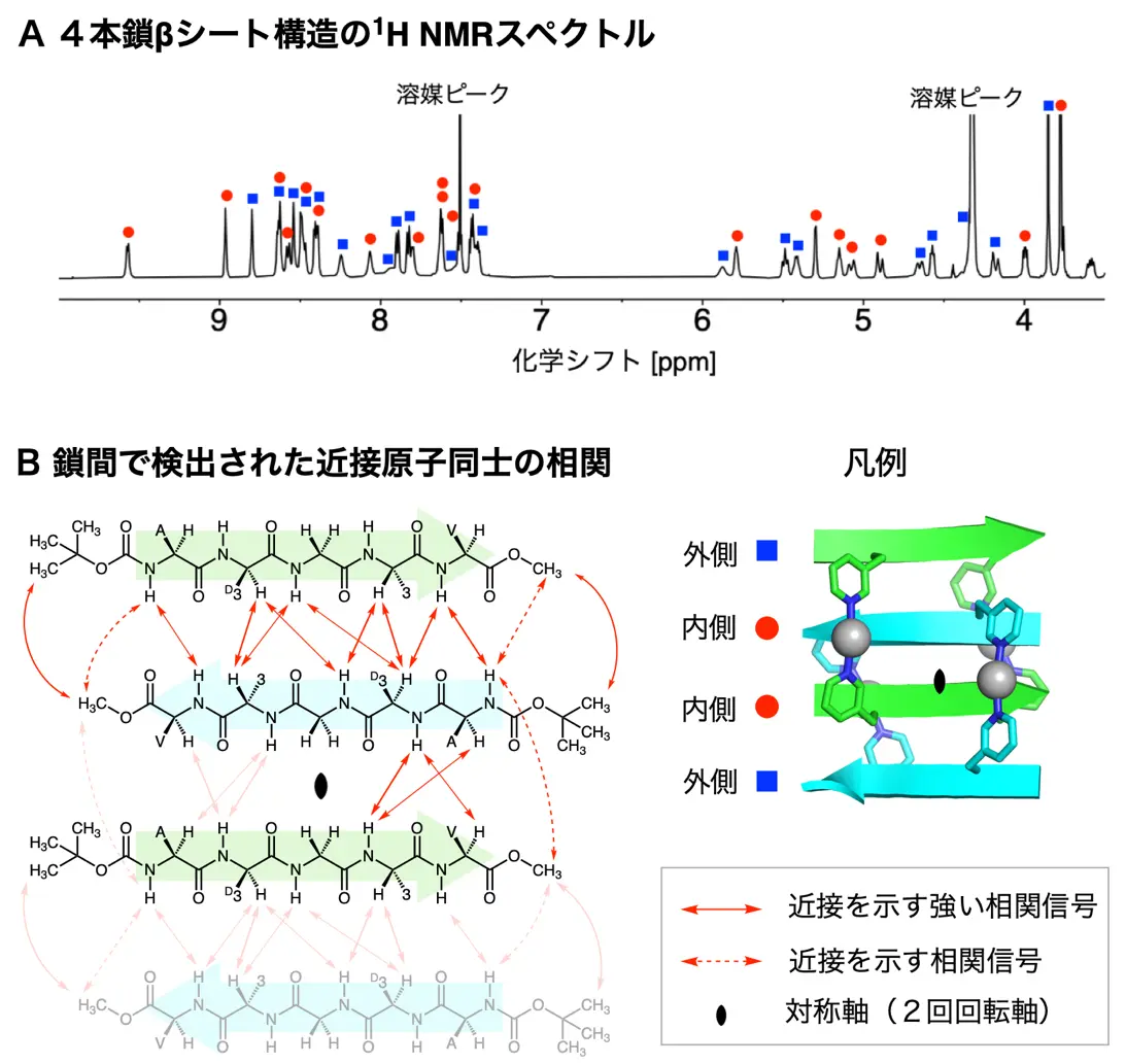 得られた4本鎖βシート構造は、溶液中においてもその構造が崩れずに、一定の構造を保つことがNMR測定[用語8]によって確認されました(図3)。4本のペプチド鎖のうち、外側の2本と内側の2本が区別されて観測され、各ペプチド鎖の間に近接している原子間に現れる相関信号が多数検出されました。これらの信号の解析を行ったところ、上述の結晶状態での分子構造と矛盾がないことから、固体(結晶)状態のみならず溶液状態においても精密な4本鎖βシート構造を形成していることが実証されました。