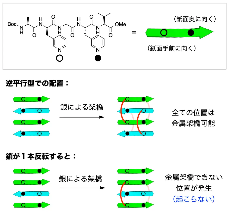 生体内で生命機能を担うタンパク質の立体構造中には、βシート構造が至るところに見られます。βシート構造は、真っ直ぐに伸びたペプチド鎖が複数会合し、互いに水素結合によって安定なシート状となった分子構造であり、タンパク質の構造安定性を大きく高める性質や、タンパク質同士の会合に関わる役割が知られています。そのような生体の優れた分子構造を人工的に利用するために、βシート構造の人工合成や材料への応用が盛んに研究されていますが、βシート構造を形成するペプチド配列には、鎖間に相互作用が強く働くために、会合の制御は困難であり、精密にペプチド鎖を配置させることが大きな課題となっていました。
