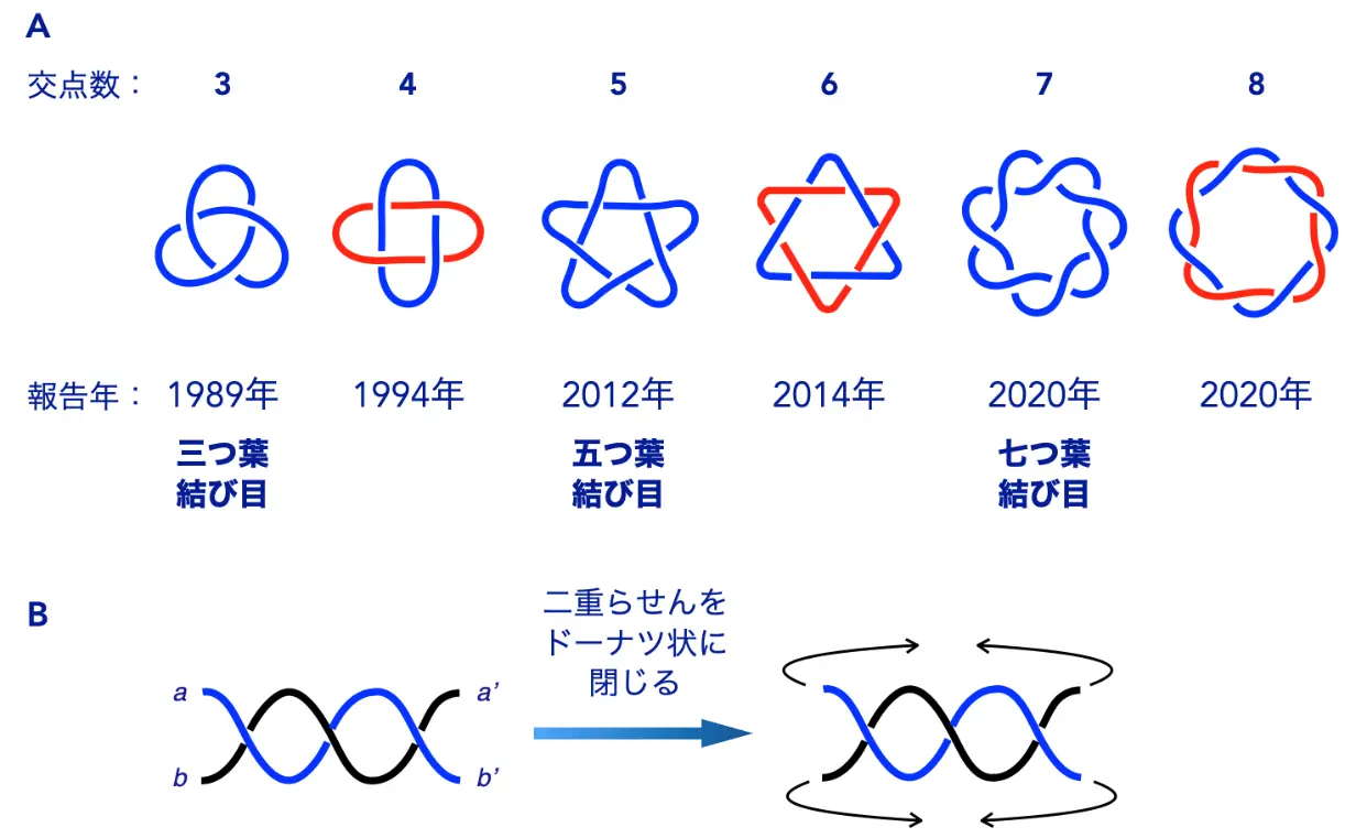 (A:化学合成の歴史、B:トーラス結び目のでき方)