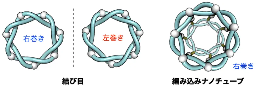 - 編み込みナノチューブ構造:ナノメートルサイズの太さをもつ円筒状の分子構造をナノチューブという。炭素でできたカーボンナノチューブをはじめ、さまざまな例がありナノ材料として利用される。通常、平らなシートを丸めた構造をしているが、本成果ではヒモを編み込む構造からなっており、編み込みナノチューブと呼んでいる。
