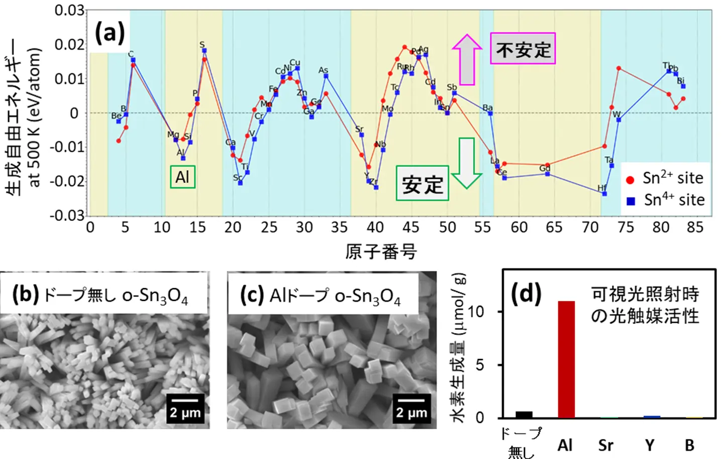 - アルミニウムイオンをドープしたo-Sn3O4を合成し、可視光照射下での高い光触媒活性を確認