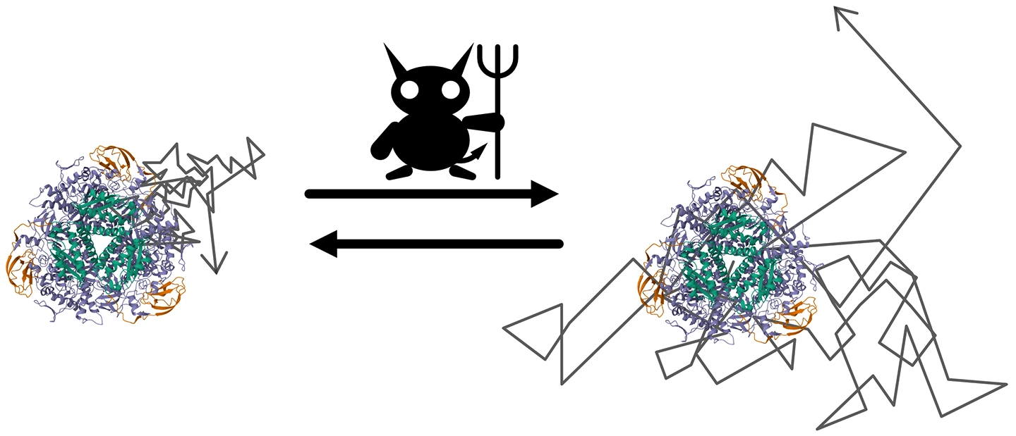 研究チームは、酵素を「反応状態に応じて拡散係数が変化する粒子」として記述する理論モデルを構築し、シミュレーションと解析を行いました。その結果、EEDを示す酵素は、熱力学によれば本来釣り合うはずの正反応と逆反応のバランスを破ることが明らかになりました(図2)。その物理的なメカニズムは、以下のように、非平衡統計力学や情報熱力学における「マクスウェルの悪魔」の働きとして理解できます(図3)。
