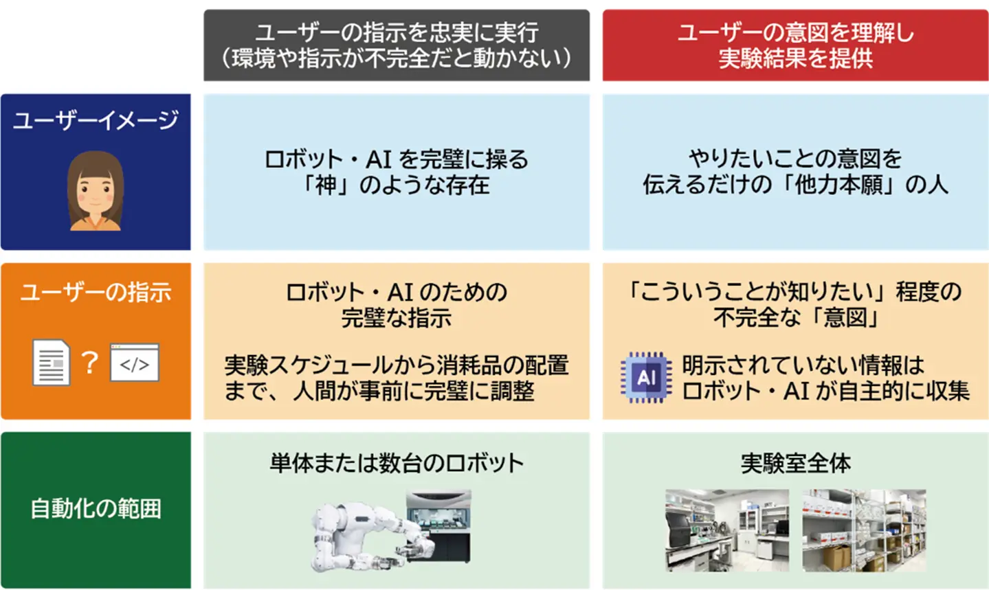 従来の自動化ラボはユーザーの指示を忠実に実行することを目的とし、環境や指示の不完全さに対応できなかったのに対し、SeM対応ラボではユーザーの意図を理解し実験結果を提供することを目的とする、という発想の大転換があります。個別のロボットによって実験操作が自動化された従来の自動化ラボでは、ユーザーは、実験スケジュールから消耗品配置まで事前に把握・調整した上で、ロボット・AIに完璧な指示を与えることができる「完全情報を提供する理想的存在」であることが求められます。一方、ラボ全体が包括的に自動化されるSeM対応ラボでは、ユーザーは「意図を伝え、不完全情報を持つ協力者」として位置付け直され、ユーザーから明示されていない情報はラボ自身が自主的に収集します(図2)。