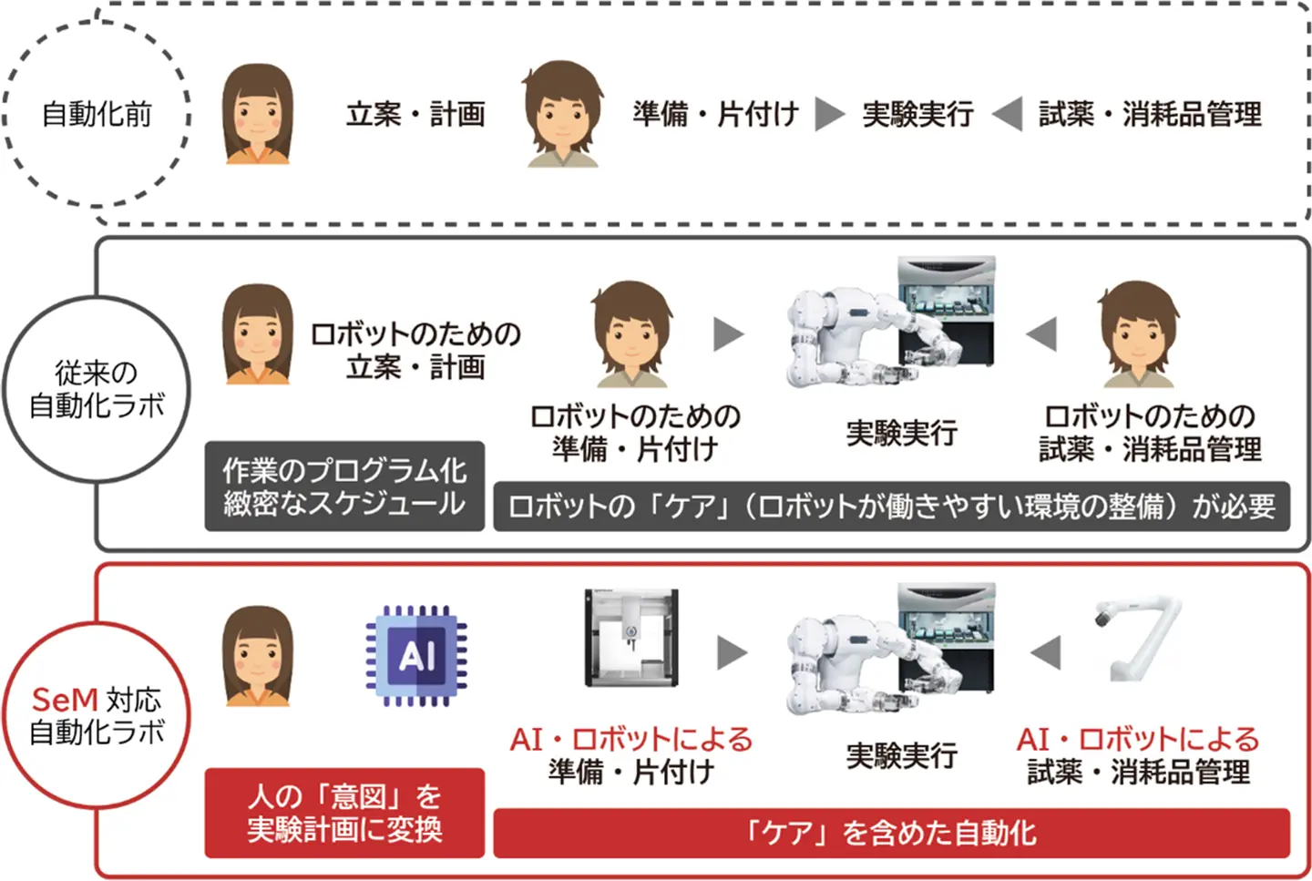 従来の自動化ラボ(左)では「自動化」の範囲とされていなかった実験システムへの試薬・消耗品出入りや、想定外の撹乱(かくらん)に対して、SeM対応ラボ(右)は自身の状態を把握し対応する能力を持つ。