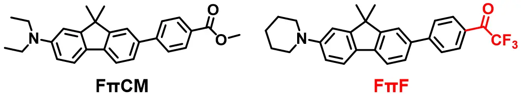 今回は、光の生体透過性が高い赤色領域で発光する色素を開発するために強い電子吸引性基であるトリフルオロアセチル基を用いた色素FπFを設計しました。FπFの蛍光特性を調べたところ、大幅な蛍光波長変化とそれに伴う蛍光強度変化が認められました。特に、テトラヒドロフラン(THF)中において310 nmという過去に例のないストークスシフト[用語3]を示しました(図3)。