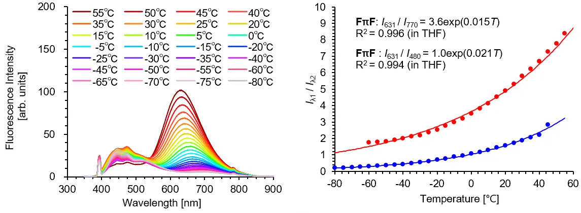 温度は、化学、物理、生命科学などの広い研究領域において、システムの機能に影響を与える重要な変数です。温度を知る手法の中でも、蛍光温度測定は、外部から非接触で高精度の温度センシングが可能なため、大きな注目を集めています。蛍光温度計(FT)として、蛍光の波長・強度・寿命などの温度応答性を利用した有機分子、量子ドット、高分子ミセルなどがこれまでに開発されてきましたが、温度測定が可能な分析対象はまだ限定的です。一方で、近年、ミトコンドリアの熱産生のような生命現象における温度変化の連続観察の重要性が叫ばれており、高い空間分解能、分析対象物への非侵襲性、発光機能の調整の観点から、分子量の小さな単一の発色団の有機分子を用いた温度測定が適切と考えられます。また、分析方法として、単なる蛍光強度の変化ではなく、特定の二つの蛍光波長での蛍光強度比を用いるレシオメトリックな分析が望ましいと言えます。レシオメトリックな分析は濃度や励起光強度の影響を受けないという特徴を持ちますが、温度測定のためには、選択した二つの蛍光波長において異なる蛍光強度変化を示す必要があります。さらに、従来の分子温度計の大半は、ローダミンBのように、温度が上昇すると蛍光強度が減少する「負の温度効果」を示す色素が用いられてきました。温度上昇時の感度を向上させるためには、温度上昇により蛍光強度が高まる「正の温度効果」を利用することが望ましく、そのためには温度上昇による内部転換[用語2]に打ち勝つ必要があります。しかしながら、(1)分子量が小さい、(2)特定の二つの波長で蛍光強度変化を示す、(3)温度上昇時に内部転換をしない、といった条件を満たす分子の探索は困難でした。