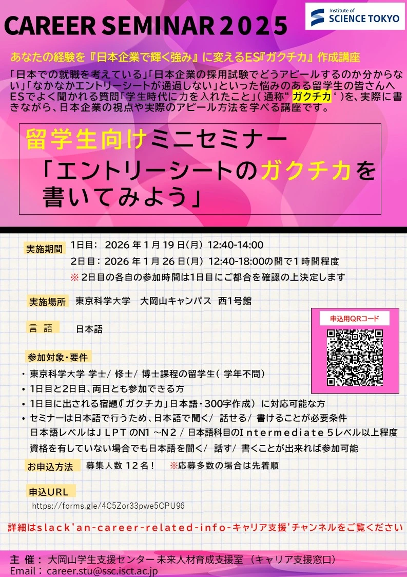 Science TokyoのキャリアアドバイザーとILA日本語セクションの先生が講師となり、日本での就職を選択肢の1つとして考えている留学生の皆さまに向けて開催します。