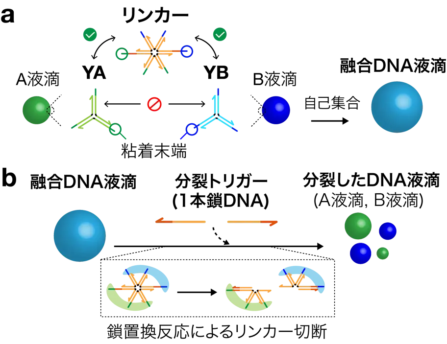 DNA液滴は、DNAナノ構造体が粘着末端同士の結合を介して自己集合することで形成される。お互いに結合しない2種類のY字型DNAナノ構造体(YA, YB)と、両方の粘着末端を持ち、YAとYBを架橋するリンカーDNAナノ構造体(リンカー)を自己集合させることで形成される融合DNA液滴(図3a)は、1本鎖DNAである分裂トリガーが引き起こす鎖置換反応[用語5]によってリンカーが切断されることで、YA由来のDNA液滴(A液滴)と YB由来のDNA液滴(B液滴)に分裂することが知られている[参考文献1](図3b)。そこで研究グループは、酵素反応を用いて分裂トリガーの生成を時間制御し、リンカーの切断速度を変化させることで、融合DNA液滴の分裂に要する時間を制御できると考えた。