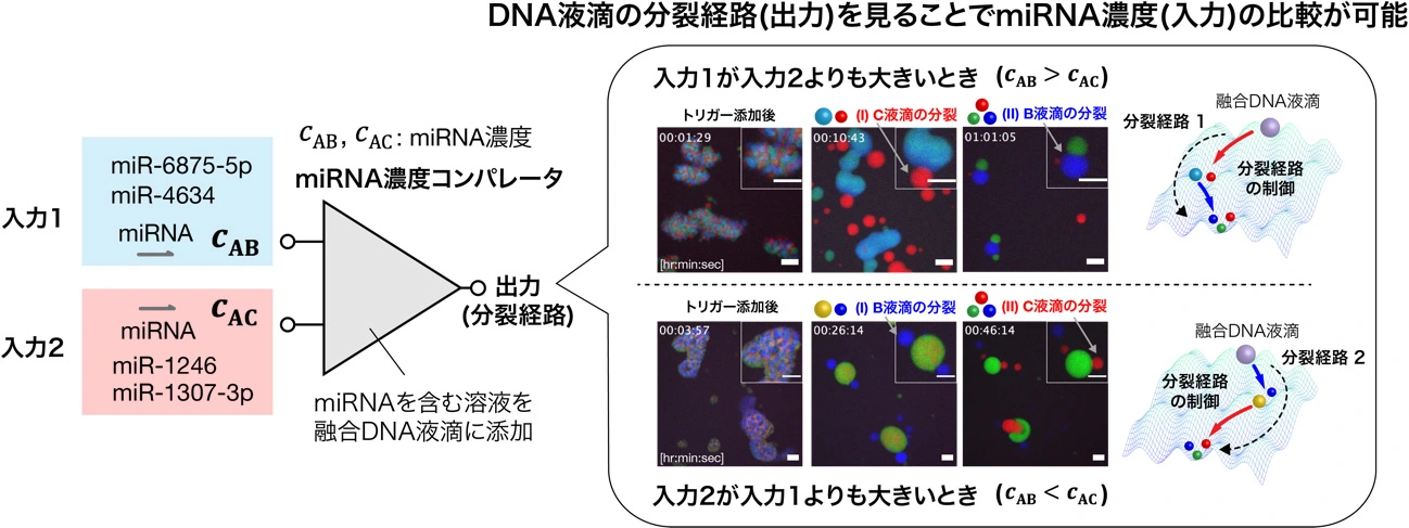 本研究グループは、DNA液滴の分裂に要する時間を制御する機構を開発し、DNA液滴の多段階分裂における分裂経路の制御を実現した。また、DNA液滴の多段階分裂を利用し、DNA液滴に対して、がんのバイオマーカーであるマイクロRNAの濃度比較を行う分子コンピューティング機能を実装することに成功した(図2)。