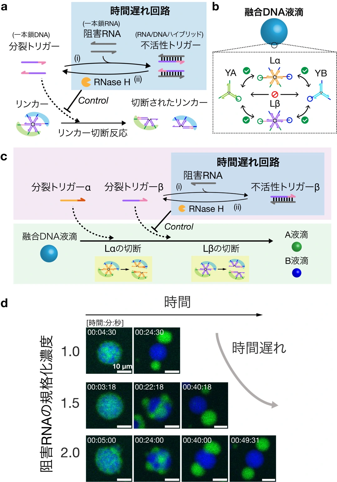 このリンカーの切断速度を変化させるための反応として、「時間遅れ回路」を設計した(図4a)。時間遅れ回路は、(i) 分裂トリガー(1本鎖DNA)と阻害RNA(マイクロRNA)の結合による不活性トリガーの形成、(ii) リボヌクレアーゼH(RNase H)[用語6]による不活性トリガーから分裂トリガーの生成、の2つの反応によって構築される。これらの反応の速度を変化させることで、分裂トリガーの生成速度が制御され、結果的にDNA液滴の分裂の速度が制御される。本研究では、YA, YBと、2種類のリンカーナノ構造体(Lα, Lβ)を自己集合させることで形成される融合DNA液滴を用いた(図4b)。ここでは、Lβの切断速度が時間遅れ回路で変化する(図4c)。阻害RNA濃度を上げると、(i) の反応が促進されることでDNA液滴の分裂が遅くなることが確認されたことから(図4d)、時間遅れ反応を用いることで分裂に要する時間を制御できることが示された。