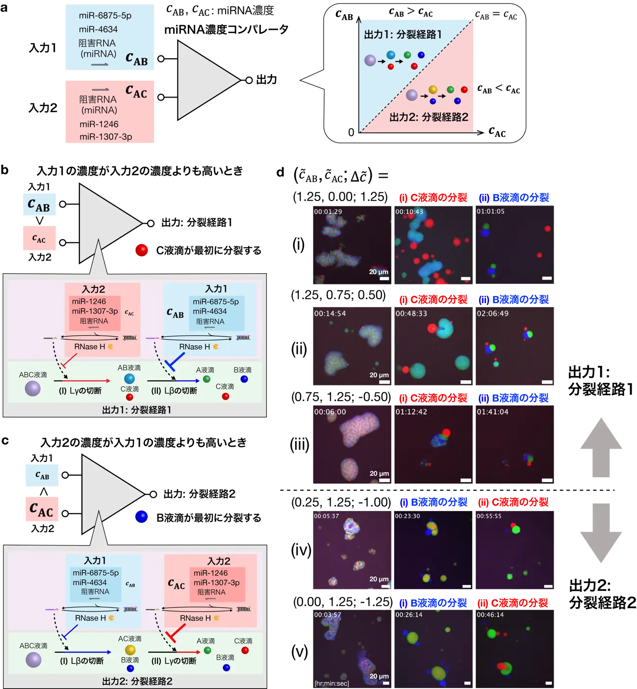 最後に、多段階分裂の経路制御を利用し、がんのバイオマーカーとなるマイクロRNA(miRNA)の濃度を比較する、分子コンピューティング機能の構築を目指した(図6a)。LβとLγの両方のリンカーに対して時間遅れ回路を用いた反応系では、2つの時間遅れ回路の阻害RNAの濃度の差に応じてABC融合液滴の分裂経路が変わる(図6b, c)。ここで、LβとLγの阻害RNAの濃度を入力(入力1、入力2)、分裂経路を出力として見た場合、この反応系は2つの入力の大小に応じて異なる分裂経路を出力する分子コンピューティングとして働いている。このように複数の入力の大小によって出力が変わるコンピュータ素子はコンパレータ[用語7]と呼ばれており、今回の反応系はDNA液滴を用いた分子コンパレータとなっている。
