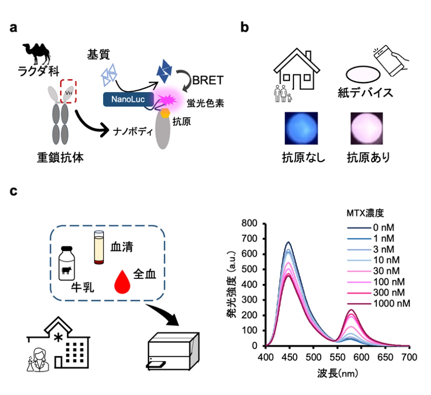 本研究では、シグナルが夾雑物による影響を受けにくく、さらにセンサー自身が熱などのさまざまな過酷な条件に対して安定な生物発光免疫センサーBRET nano Q-bodyを開発しました。この免疫センサーは、ラクダ科動物に由来する重鎖抗体の可変領域(ナノボディ)に、赤色の蛍光色素TAMRAが化学修飾されており、さらにリンカーを介して青色の生物発光酵素NanoLuc[用語6]が融合されています(図1a)。ナノボディは高温下や変性条件下といったタンパク質にとって過酷な環境でも安定性が高く、NanoLucは明るい生物発光を示すという特長を持っています。これらの特長を生かすことで、POCTに適した、丈夫で長持ちし、かつ応答の大きい免疫センサーを作製できると考えました。なお生物発光は、励起光を必要としないこと、蛍光に比べて光散乱の影響が少ないことが知られています。そのため、生物発光を利用したこの免疫センサーは、よりシンプルな検出装置で操作でき、不透明な懸濁液への応用も視野に入れることができます。今回の研究ではモデルとして、抗がん剤の一つで、投与後の血中濃度モニタリングが必要なメトトレキサート(MTX)を認識するナノボディを用いることにしました。