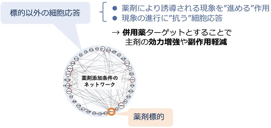 さまざまな条件下で描いたネットワークを比較することで、薬剤の有無による細胞状態の違いを一目で把握することができ、薬剤の作用機序解明への大きな手がかりが得られることが期待できます。また、ネットワークに現れる多面的な細胞応答には、薬剤により誘導される現象を“進める”作用と、現象の進行に“抗う”細胞応答の両方が含まれていると考えられます。それらの情報を活用することで、より望ましい薬剤の効果を得るための併用薬の探索にも役立てられることが期待できます。