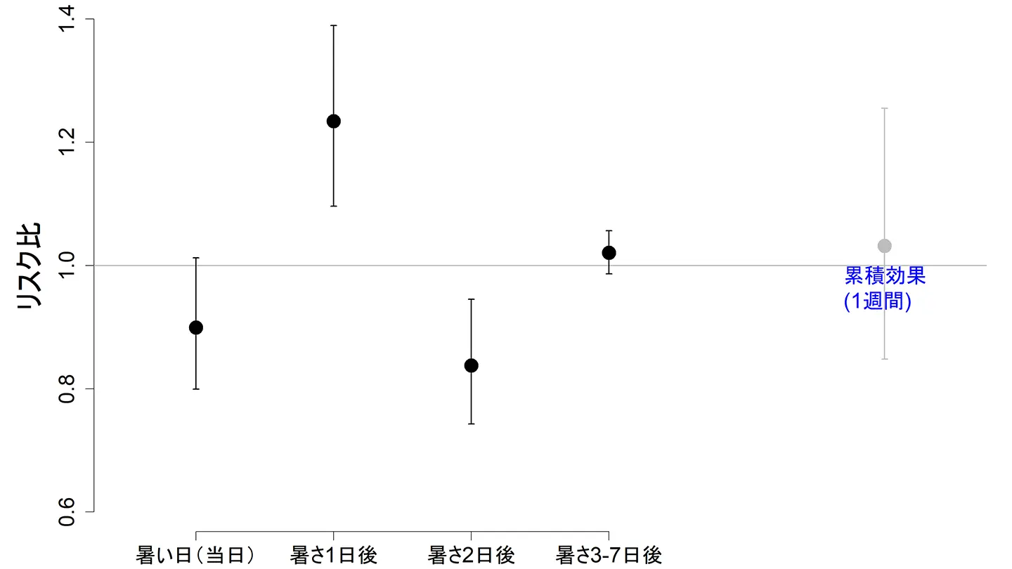 一方、その翌々日にはリスクが有意に低下しており(リスク比0.84、95%信頼区間:0.74–0.95)、1週間全体で見るとリスクの上昇は相殺されていました。これは、もともと数日後に発症するはずだった症例が、猛暑によって発症のタイミングが前倒しになった可能性を示唆する結果といえます。