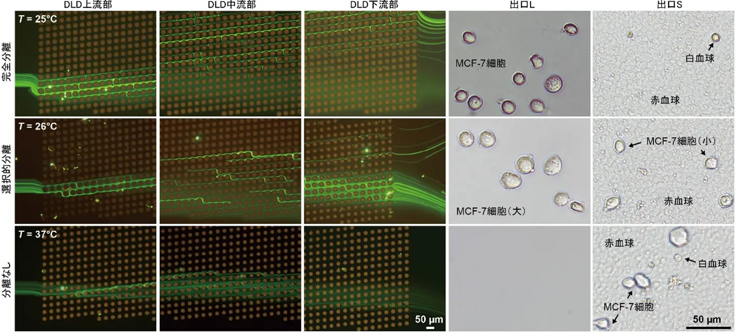 東京科学大学(Science Tokyo) 総合研究院 未来産業技術研究所の西迫貴志准教授、菅野佑介助教、工学院機械系機械コースのJIANG Ze(キョウ・タク)大学院生らの研究グループは、温度応答性ハイドロゲル「PNIPAM(ポリ(N-イソプロピルアクリルアミド))[用語1]」を用いた可変臨界径型DLD(Deterministic Lateral Displacement)[用語2] マイクロ流体デバイス[用語3]を開発し、標的細胞に応じた分離条件の切り替えを温度制御のみで行うことができる新たな細胞分離技術を確立しました。