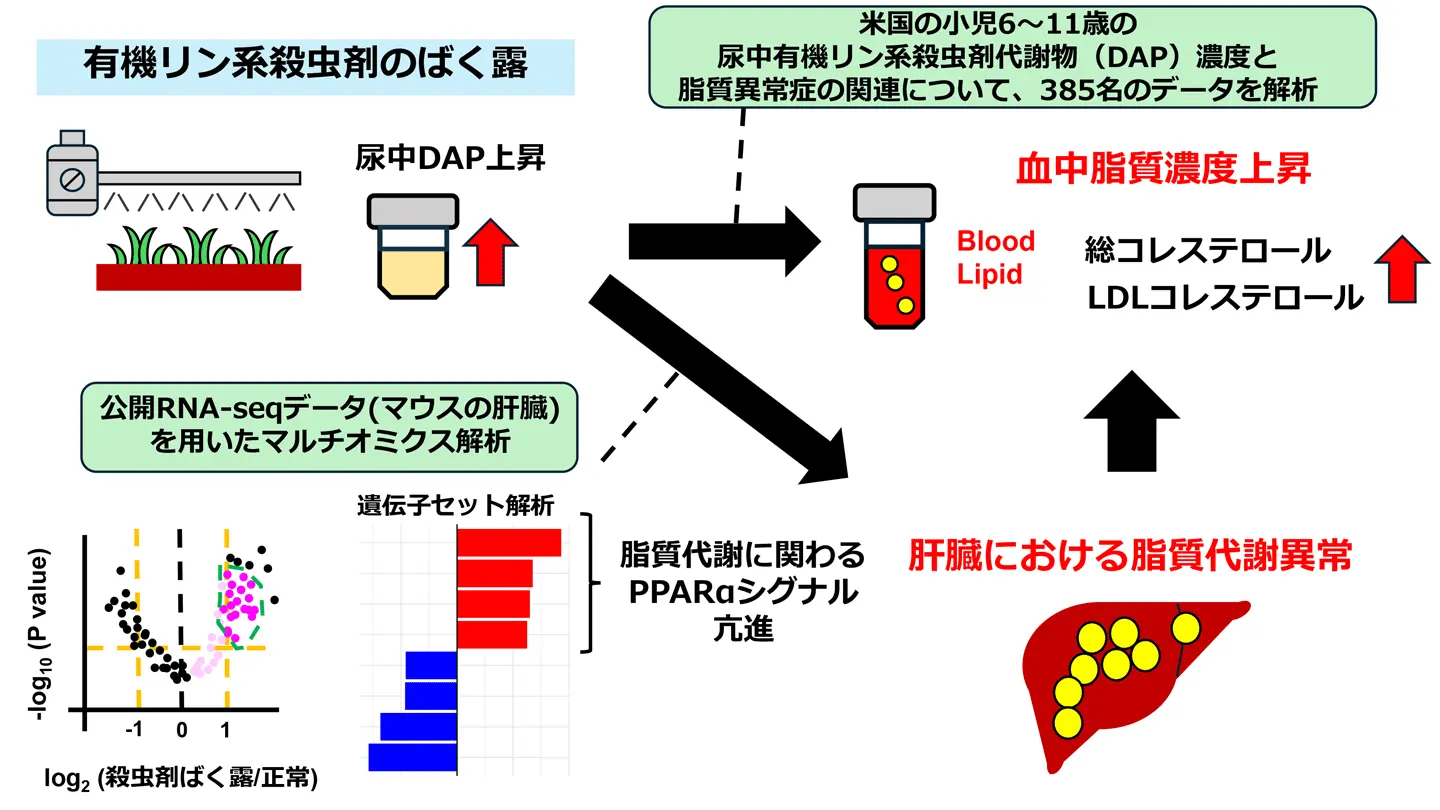 これらの結果から、有機リン系殺虫剤へのばく露は肝臓の脂質代謝を変化させ、脂質異常症のリスクを高める可能性が示唆されました。