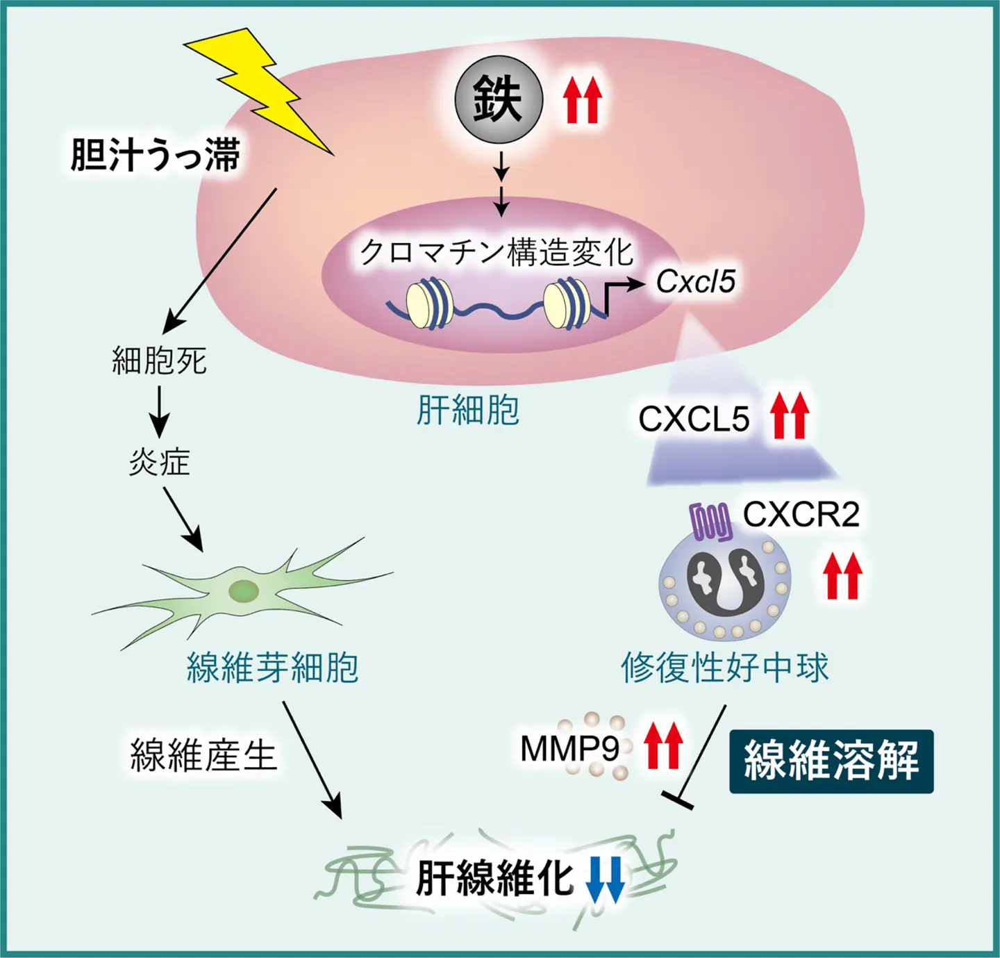 - 鉄がCXCL5の発現を増加させ、それにより線維溶解酵素MMP9を産生する好中球の肝臓への集積が促され、線維分解が進む仕組みを解明した。