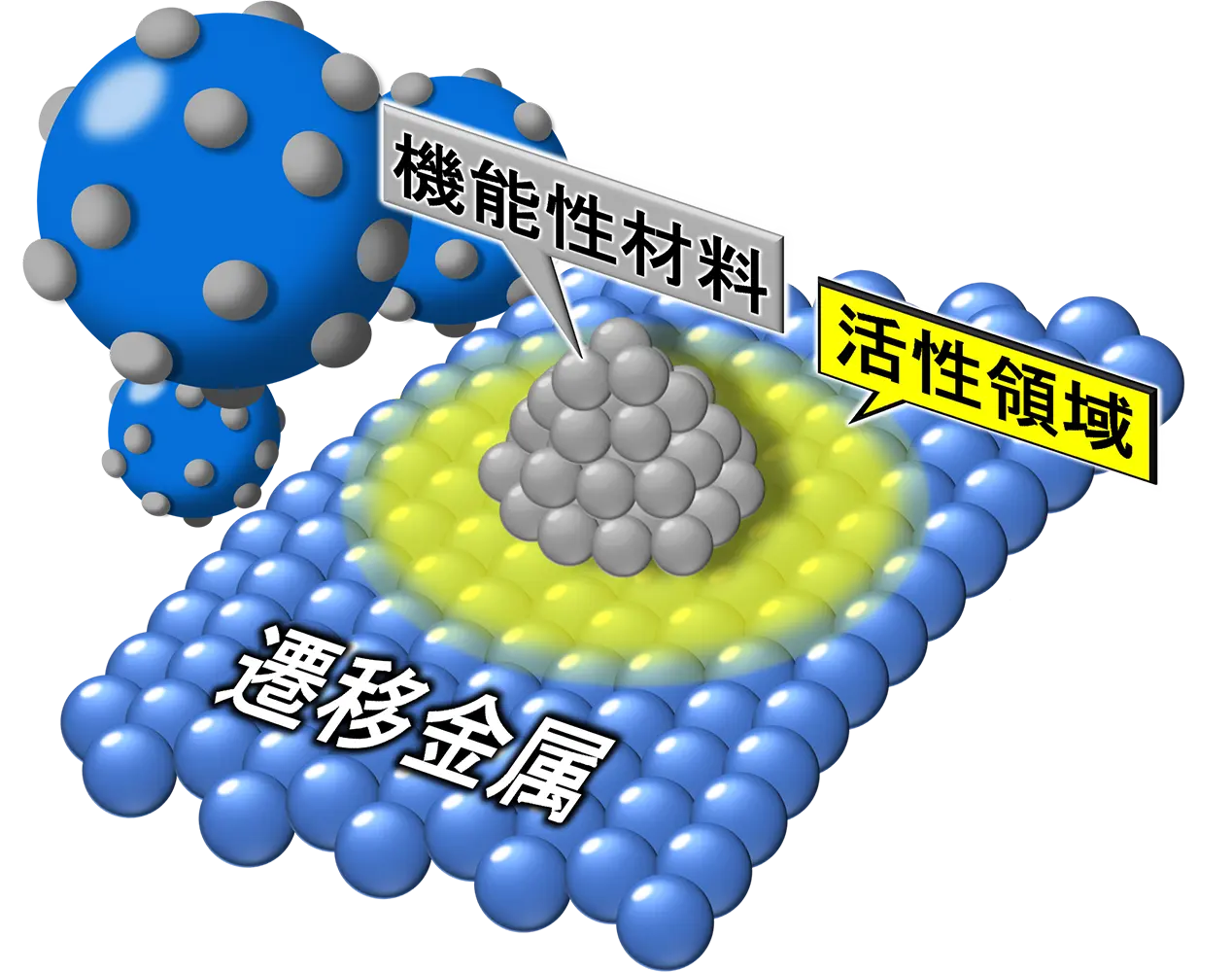 そこで本研究では担持触媒を逆転させた構造を採用しました(図4B)。逆転構造の触媒では、密度の大きな金属粒子の表面にナノサイズの機能性材料「電位供与体」が固定化されます。担持触媒構造のアンモニア合成触媒では、電子供与体の担体の上に金属ナノ粒子が固定化されるため、反応に有効な活性領域は担体-金属ナノ粒子界面の外周金属原子に制限されています(図4A)。これに対して、この逆転構造では活性領域が電子供与体と金属表面の接合点を中心として同心円状に広がります。どちらの構造がアンモニア合成に有効かはこれまで研究されたことはありませんが、逆転構造は密度が高いため、高い触媒性能/容積を期待できます。