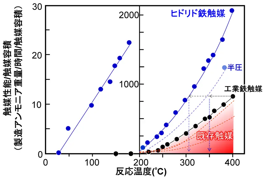 図中の「半圧」はヒドリド鉄触媒での圧力を半減させたときの結果